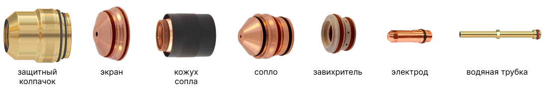 Сила тока | Защитный колпак | Экран | Кожух | Сопло | Завихритель | Электрод | Водяная трубка |